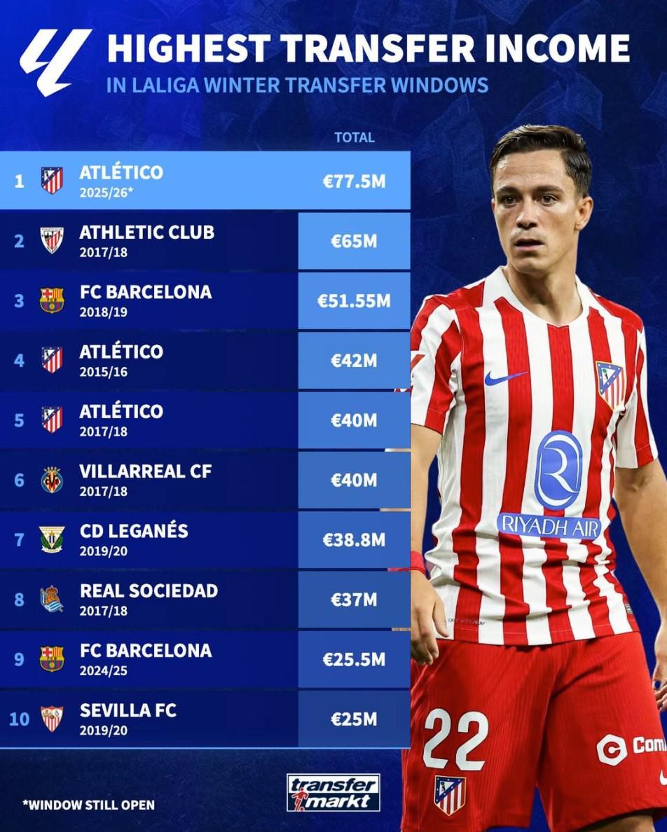 德转列西甲历史冬窗转会收入榜:本赛季马竞7750万欧元第1