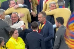 科贝电台记者Víctor Navarro在社交媒体上晒出巴萨赛后庆祝的视频,巴萨主席拉波尔塔与主帅弗里克拥抱。